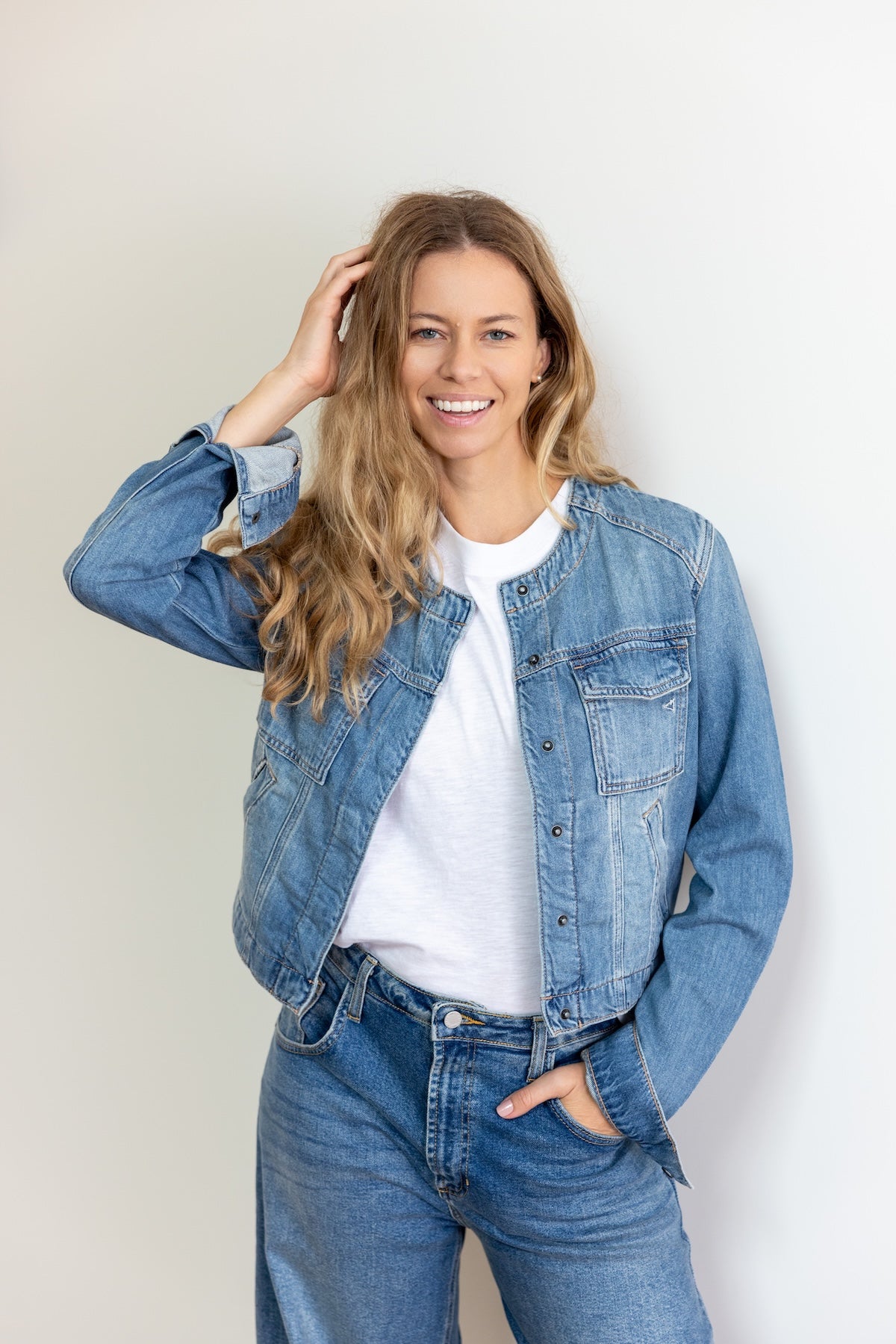 Made from premium washed denim, the James Jacket is a fresh, modern take on the classic jean jacket. Designed with a collarless neckline and a slightly cropped silhouette, it’s the perfect layering piece for year-round wear. Throw it over dresses, tees, or tanks for an easy style upgrade.