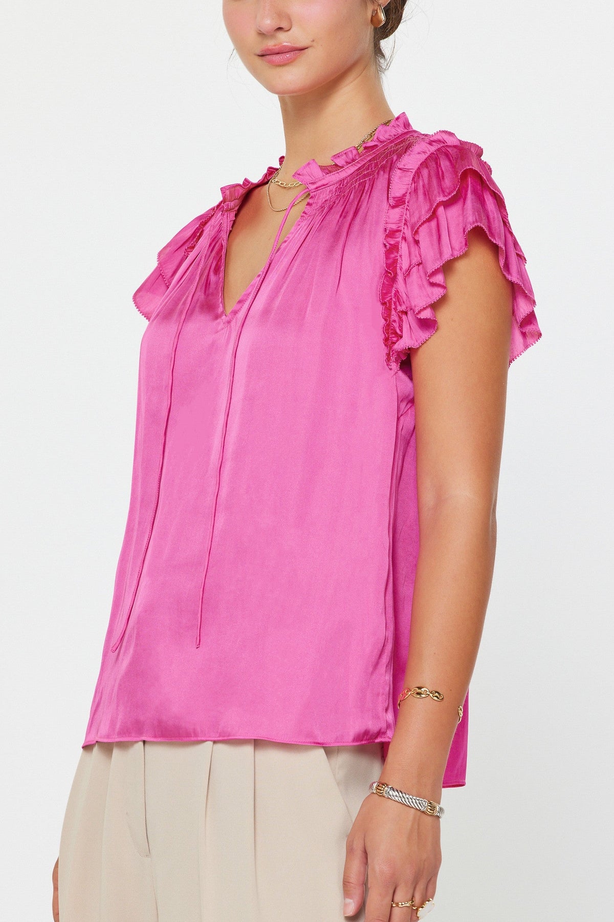 Effortless elegance meets vibrant charm. The Daisy Short Sleeve Top features a stunning hue and a flowy, feminine silhouette. Designed with delicate ruffle detailing at the shoulders and a subtle tie-neckline, this top transitions seamlessly from a polished office look to a chic weekend brunch.