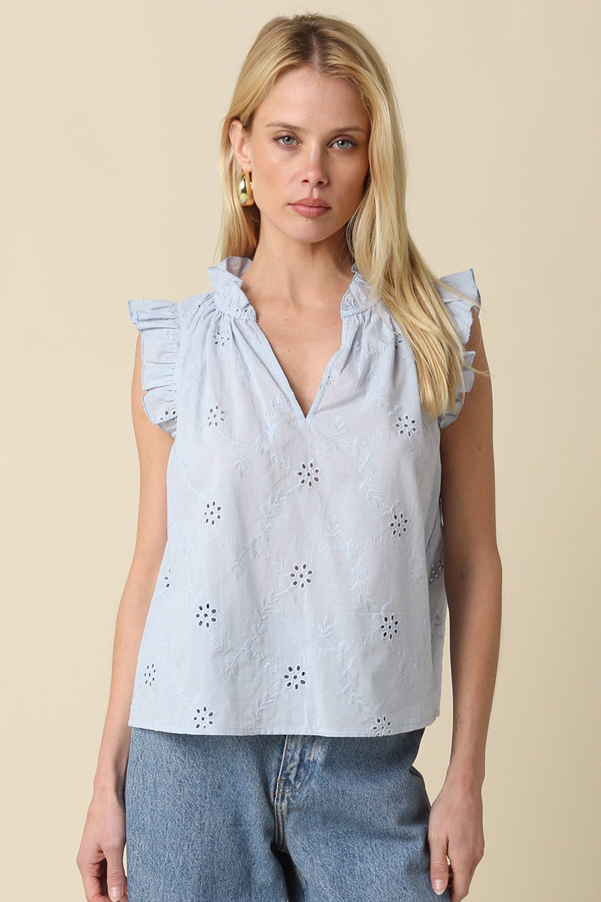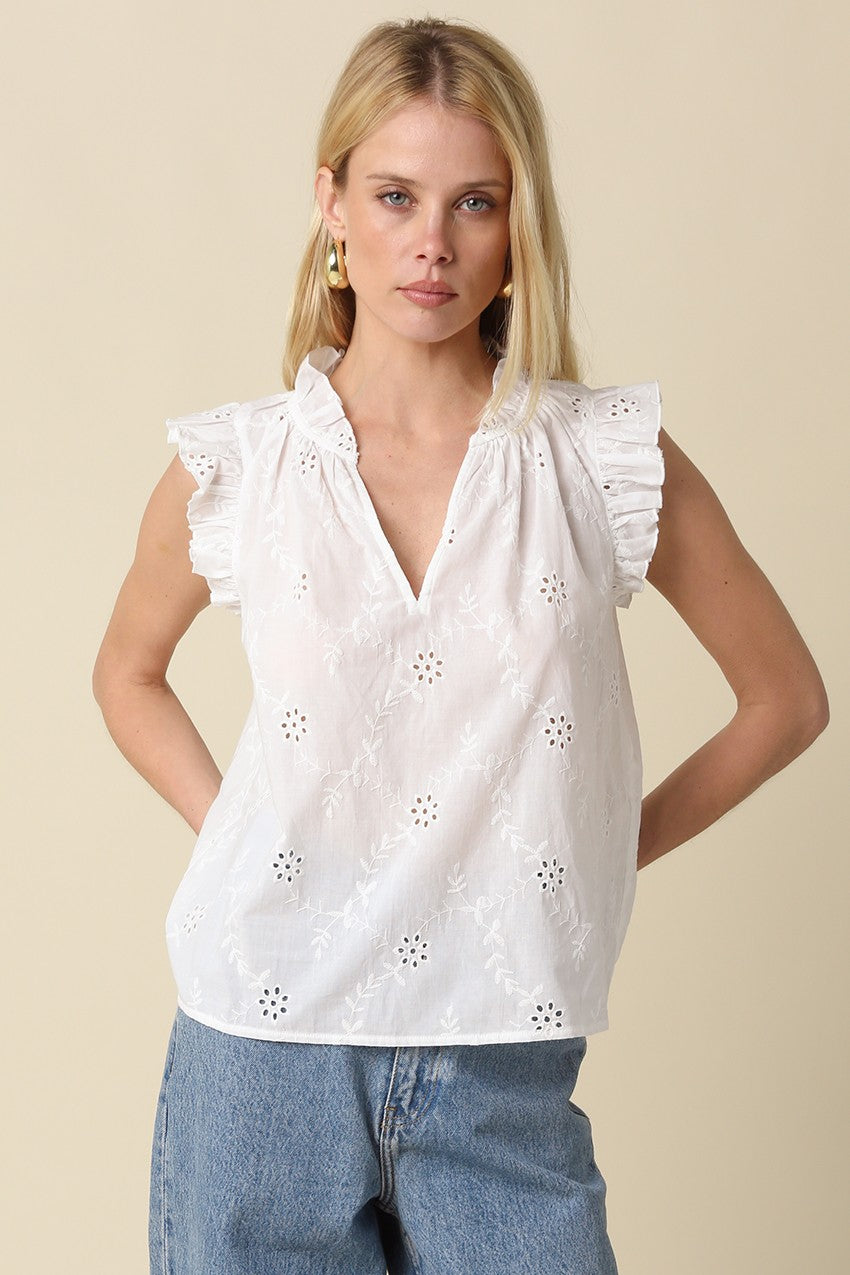 Elevate your everyday rotation with the Celeste Top. Crafted from a lightweight, breathable fabric, this top features delicate floral eyelet embroidery that adds a touch of charm.